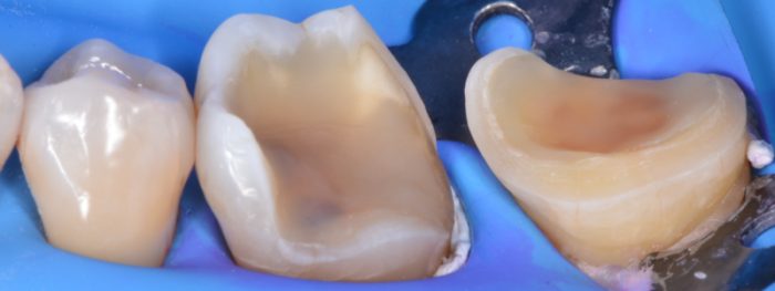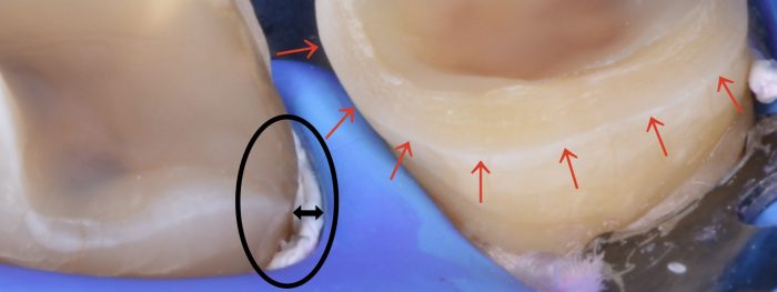 また、右の歯の赤矢印で示す削ったラインは、ガタガタでなく滑らかにつながっていると、精密なセラミックの被せ物を作ることができます。