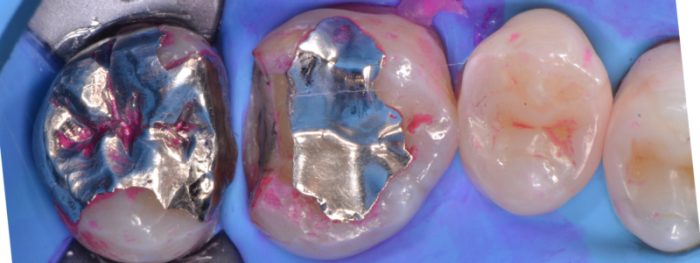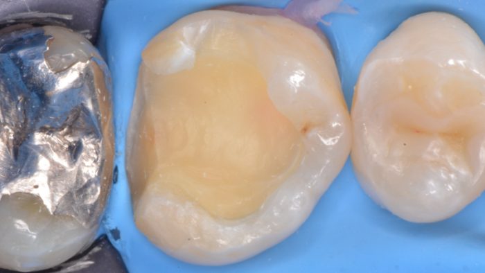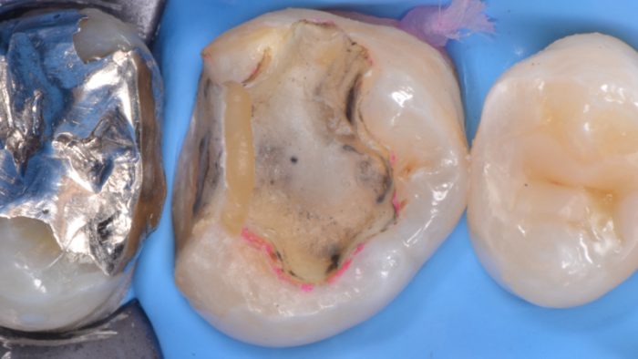 ラバーダム防湿とクリーニングで作った清潔な環境のもと、唾液から細菌感染することなく、銀歯の中の虫歯菌を取り除き、完全に清潔な歯だけになりました。